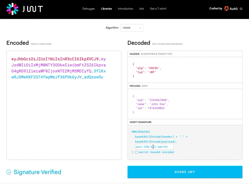 시그니처는 헤더(header)와 페이로드(payload)를 합친 문자열을 서명한 값입니다. 헤더의 alg에 정의된 알고리즘과 시그니처의 secret key를 이용하여 생성하고 Base64로 인코딩합니다.