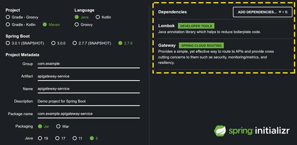apigateway-service는 lombok, spring-cloud-starter-gateway dependency를 추가하여 생성했는데요.