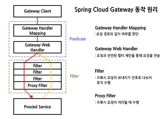 클라이언트에서 들어온 요청은 Gateway Handler Mapping을 통해 요청 경로와 일치 여부를 판단하게 되고, Gateway Web Handler에서 요청과 관련된 필터 체인을 통해 요청이 전송되게 됩니다.