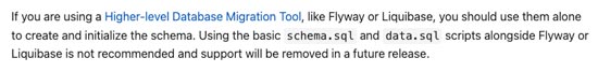 Spring Boot는 기본적으로 schema.sql과 data.sql을 통해 데이터베이스 스키마를 초기화하고 데이터를 추가할 수 있는 기능을 제공하는데요. 하지만 이 기능을 사용할 때 Flyway와 함께 사용해서는 안된다는 주의점이 있습니다.