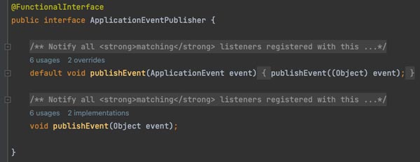 앞의 'event class'에서도 언급하였지만 Spring Framework 4.2부터 ApplicationEventPublisher 인터페이스에서 다음과 같이 모든 객체를 이벤트로 하용하는 publishEvent(Object event) 메서드가 추가되었기 때문에 event class에서 ApplicationEvent를 상속받을 필요가 없어진 것입니다.
