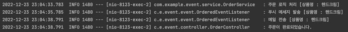 여기까지가 spring event를 적용하는 기본적인 방법이며, 이어지는 포스팅에서는 @EventListener 어노테이션보다 확장된 기능을 가진 @TransactionalEventListener 어노테이션의 사용 방법에 대해서 살펴보겠습니다.
