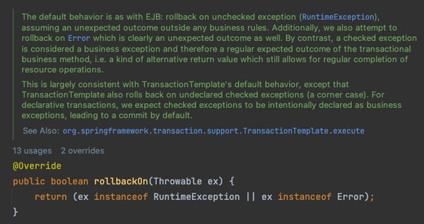 rollbackOn() 메서드에서는 다음과 같이 UncheckedException만 rollback 시킨다는 설명을 볼 수 있는데요.