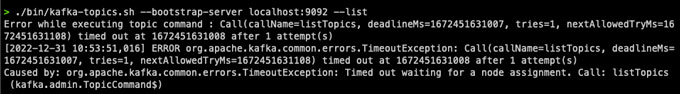 해당 실행 명령을 통해 topic 목록을 요청했을 때 아래와 같이 TimeoutException이 발생하였습니다.