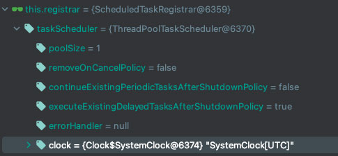 이 부분에서 ThreadPoolTaskScheduler에 설정된 SystemClock 정보를 확인할 수 있습니다.