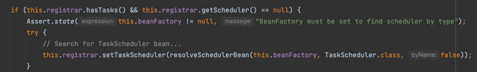 주석에서도 볼 수 있듯이 이 부분에서 빈으로 등록된 TaskScheduler 구현체를 찾는데, 이때 위에서 등록된 ThreadPoolTaskScheduler 객체를 찾아와 등록하게 되는 것입니다.