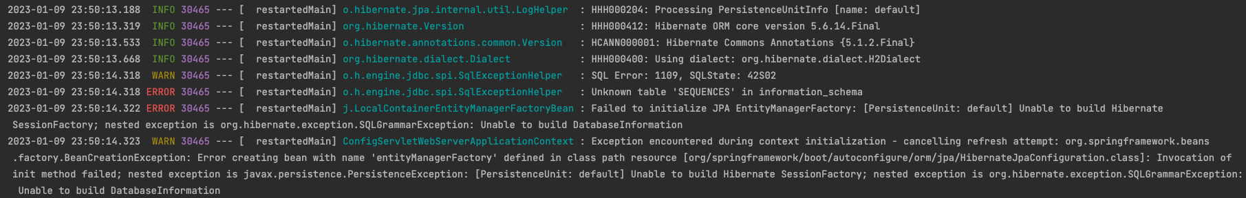 ERROR 22239 --- [ restartedMain] o.h.engine.jdbc.spi.SqlExceptionHelper : Unknown table 'SEQUENCES' in information_schema