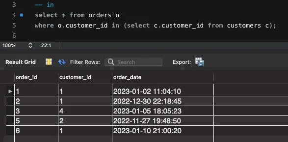 서브쿼리를 먼저 실행해서 그에 대한 결과 요소들을 가지고 온 뒤, 메인 쿼리인 orders 테이블에서 하나의 row를 가져오며, 해당 row의 customer_id 값이 in 구문이 실행된 결과 값들 중 하나라도 일치한다면 그 row를 출력하게 되는 방식입니다.