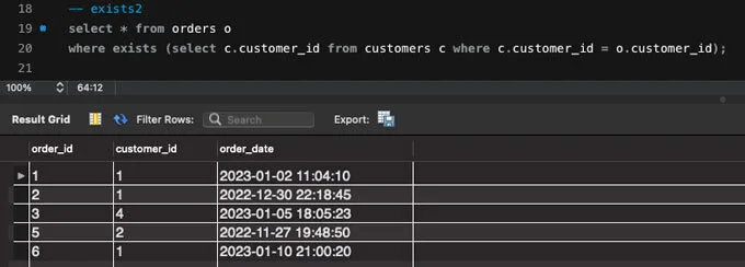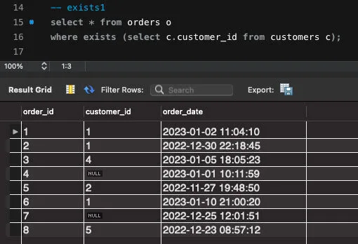 서브쿼리에서 결과가 존재하는지만을 판단하기 때문에 customer_id가 null인 row까지 출력되는 것을 확인할 수 있는데요.