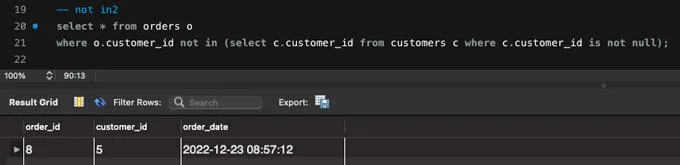 orders table의 customer_id 값이 null 인 row에서 서브쿼리의 결과 중 null 이 있으니까 출력되어야 하는 게 아닌가 생각할 수 있는데요. 출력되지 않는 이유를 살펴보면 null 값은 DB에서 비교연산을 할 때 항상 UNKNOWN(= false) 값을 반환하기 때문에 출력되지 않는 것입니다.