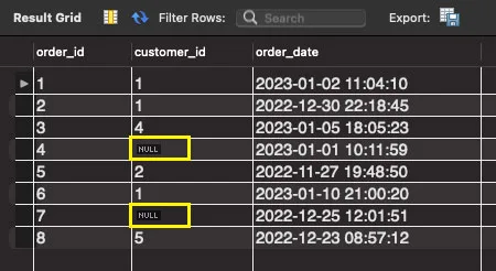 orders 테이블의 customer_id = null 인 row가 출력되는 과정을 살펴보겠습니다.