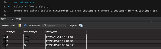 결과의 첫 번째 row인 order_id = 4인 row를 예로 들었을 때 customer_id = null입니다. 따라서 not exists 이하의 쿼리를 확인해 보면 아래와 같을 것인데요.