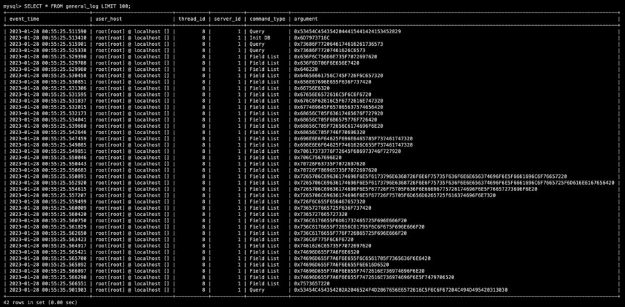 SELECT * FROM general_log LIMIT 100;