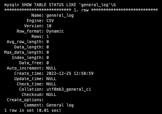 SHOW TABLE STATUS LIKE 'general_log'\G
