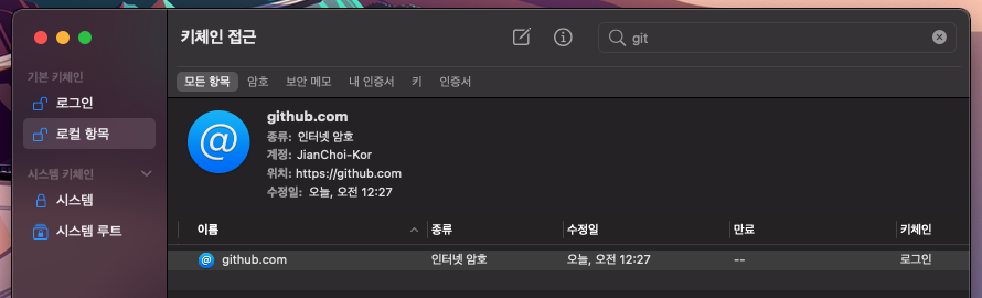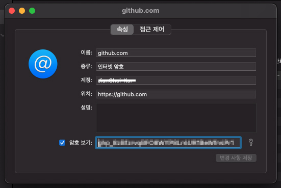 암호 보기를 클릭해보면 기존에 사용하던 github password가 저장된 것을 확인할 수 있습니다.