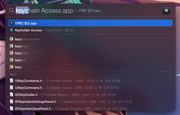 Spotlight 검색을 이용하여 '키체인 접근.app'을 실행합니다.