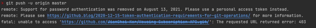 패스워드 인증 대신에 개인 엑세스액세스 토큰을 생성하여 인증을 하는 방식으로 변경되었으니 액세스 토큰을 이용하라고 합니다.