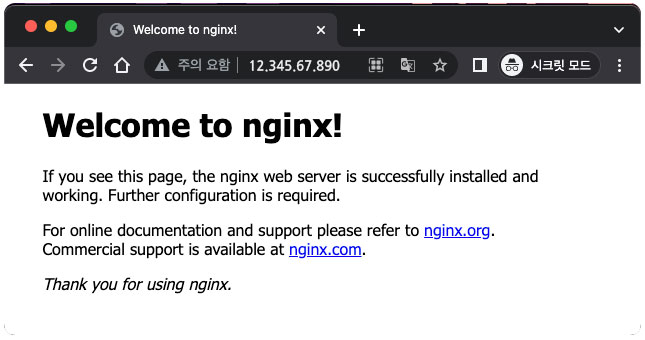 nginx가 정상적으로 설치되었다면 nginx의 기본 listen port는 80으로 설정되어 있기 때문에 해당 서버의 ip로 접근하였을 때 다음과 같이 Welcome to nginx! 라는 nginx의 기본 html 화면을 볼 수 있습니다.