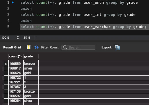 성능 비교를 위해 위 3개 테이블을 만들었으며, 각 테이블의 grade 칼럼의 타입을 enum, varchar, tinyint로 주었습니다.