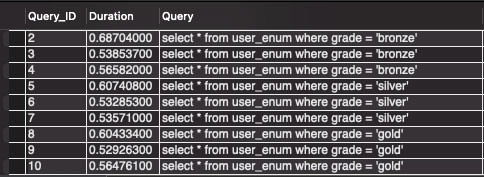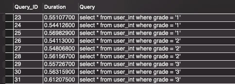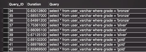이어서 user_varchar 테이블을 grade 값으로 조회한 결과입니다. 평균 지속 시간(duration)은 0.677006으로 user_enum 테이블을 조회했을 때에 비해 조금 더 오래 걸린 것을 확인할 수 있습니다.