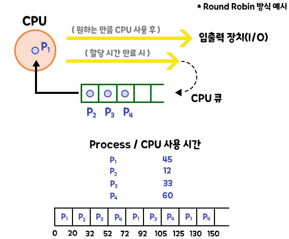 각 프로세스는 동일한 크기의 cpu 할당 시간을 가지며, 할당 시간이 끝나면 인터럽트가 발생하여 프로세스는 cpu를 빼앗기고 다시 cpu 큐의 마지막으로 돌아와 할당을 기다리게 됩니다.