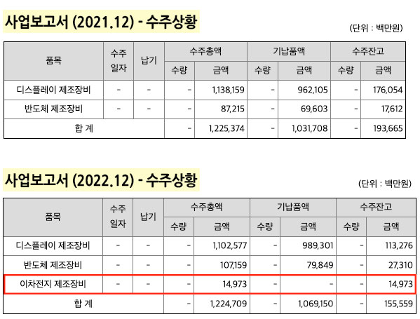 2021년 사업보고서를 살펴보면 디스플레이 제조장비, 반도체 제조장비에 대한 내역만 있는 것을 확인할 수 있는데요. 2022년에는 2차 전지 제조장비에 대한 수주 내역이 추가된 것을 볼 수 있습니다.