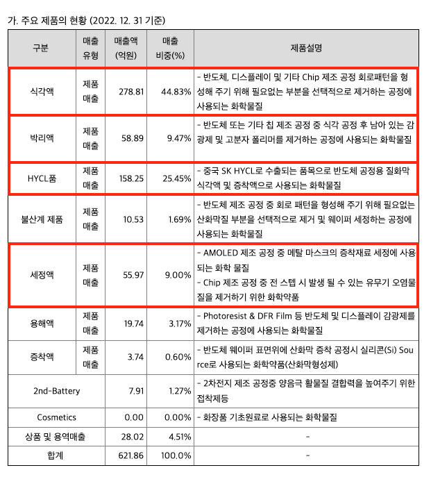 식각액(Wet etchant)의 경우 Thin film 상의 특정지역 물질을 화학반응을 통해 제거하는 포토리소그래피(Photolithography) 공정의 핵심 재료로 식각 공정에서 사용되는 재료를 이야기하며, 반도체용 산화막 식각액, 반도체용 질화막 식각액, 디스플레이 & Touch Screen Panel 용 식각액, LCD Glass Slimming 용 식각액, 4종류로 이루어져 있습니다.