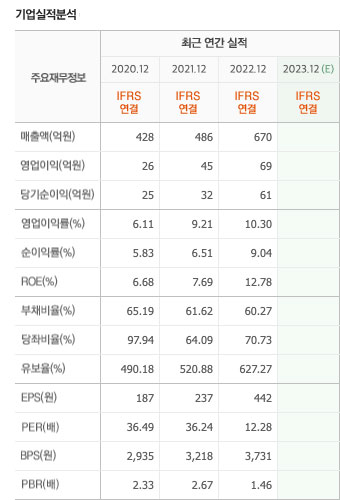 실적의 경우 단편적으로만 봐도 매출 및 영업이익이 계속 늘고 있고, 부채 비율은 줄어들며, 유보율은 높아지는 것을 볼 수 있는데요.