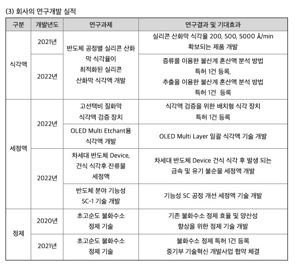연구개발에 대한 실적이 계속해서 나오고 있는 것을 볼 수 있으며 반도체, 디스플레이 및 이차전지 공정용 화학 소재 산업과 관련되어 국내 특허 17건, 해외 특허 4건을 보유하고 있습니다.