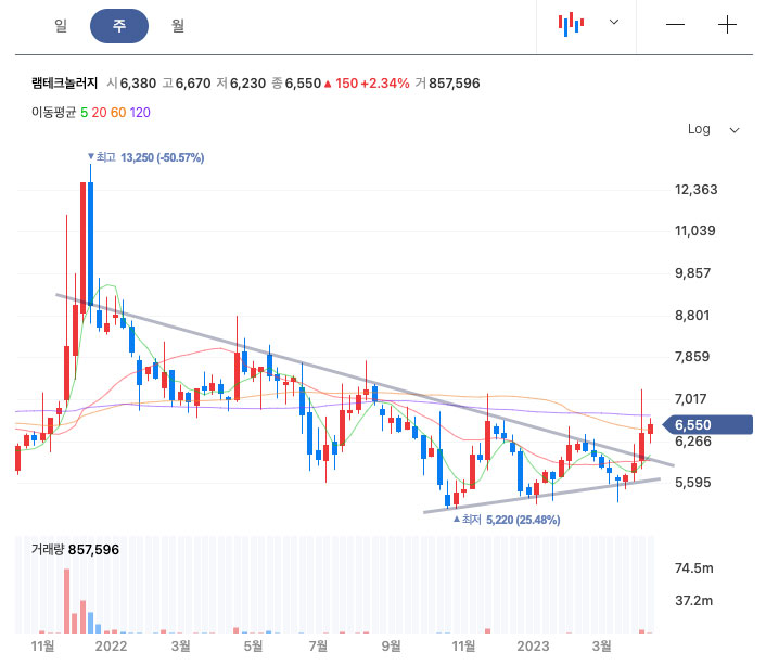 램테크놀러지의 주가는 2021년 11월 불화수소 관련 가짜 뉴스 이슈로 인해 상승한 이후 약 1년 반 가까이 하락 추세에 있었는데요.