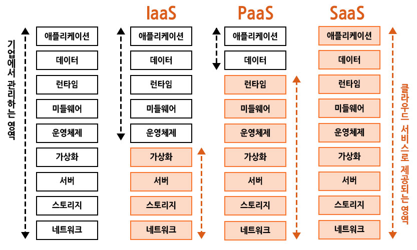 클라우드의 핵심 서비스는 크게 IaaS, PaaS, SaaS로 나뉘기도 하는데요. 각각은 클라우드의 서비스를 어느 정도 수준까지 제공하느냐로 구분되는데, 자세한 내용은 아래를 통해 살펴보겠습니다.