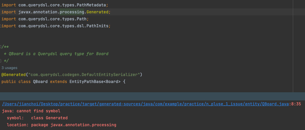 우선 첫 번째로 시도한 방법은 Q클래스의 import javax.annotation.processing.Generated 부분을 import javax.annotation.Generated로 수동으로 바꾸는 것입니다.