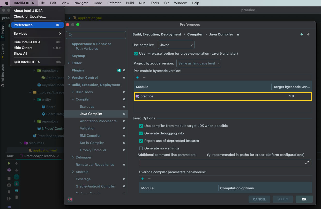 세 번째 시도는 Preferences -> Build, Execution, Deployment -> Compiler -> Java Compiler 부분의 'Pre-module bytecode version' 부분을 통한 해결 방법입니다.