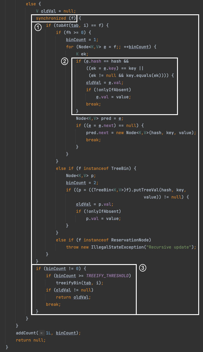 putVal() 메서드를 살펴보면 메서드 자체에 synchronized 키워드가 적용된 것이 아니라, 메서드 동작 과정에서 synchronized 키워드가 사용되는 것을 볼 수 있습니다.