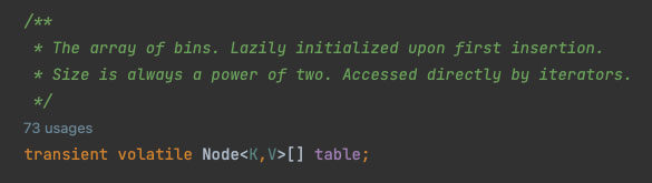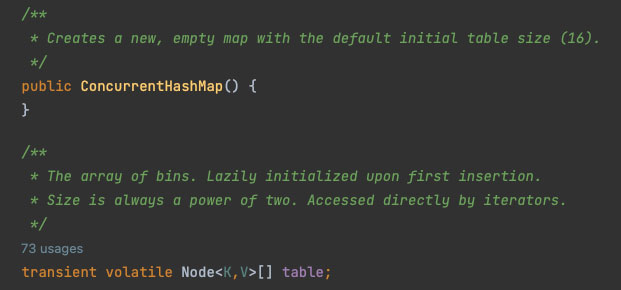 ConcurrentHashMap의 기본 생성자의 주석 부분을 살펴보면 default initial table size는 16이라는 것을 알 수 있으며, table 변수의 주석 부분을 통해 처음 node가 삽입될 때 table이 Lazily initialized 된다는 것을 알 수 있습니다.