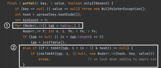 위 코드에서 1번 부분은 ConcurrentHashMap 내부적으로 관리하는 가변 배열 table을 무한 루프로 돌리는 과정인데요.