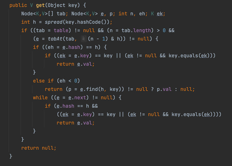 ConcurrentHashMap의 get() 메서드를 살펴보면 synchronized 키워드가 존재하지 않는 것을 볼 수 있는데요.