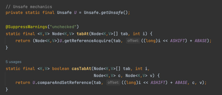 tabAt(), casTabAt() 메서드를 살펴보면 내부적으로 'Unsafe' 말 그대로 안전하지 않은 클래스의 인스턴스를 사용하는 것을 볼 수 있는데요. 간단하게 말하면 해당 인스턴스를 통해 memory를 직접 handling 하게 되는 것입니다.