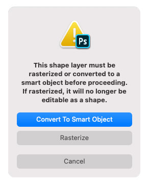 그러면 아래와 같은 메시지가 출력되고 Convert To Smart Object, Rasterize 두 가지 선택지가 나오는데요.