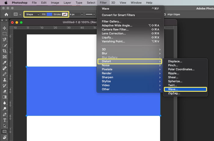 다음으로 포토샵 상단 'Filter -> Distort -> Wave...'의 경로를 통해 'Wave' 기능을 적용합니다.