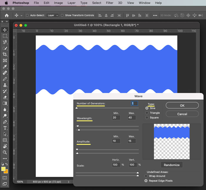해당 예시는 'Rectangle Tool'을 기반으로 물결 모양을 만드는 예시로, 사용되는 경우에 따라 'Line Tool'을 사용하여 같은 방법을 적용할 수 있습니다.