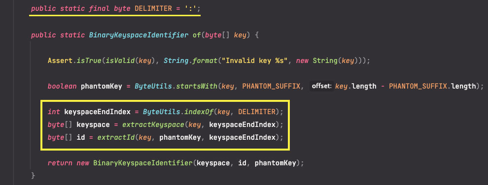 다시 BinaryKeyspaceIdentifier 클래스의 'of()' 메서드를 살펴보면 keyspaceEndIndex를 가져오는 부분에서 DELIMITER ':'를 기준으로 keyspace를 잘라오는 것을 확인할 수 있습니다.