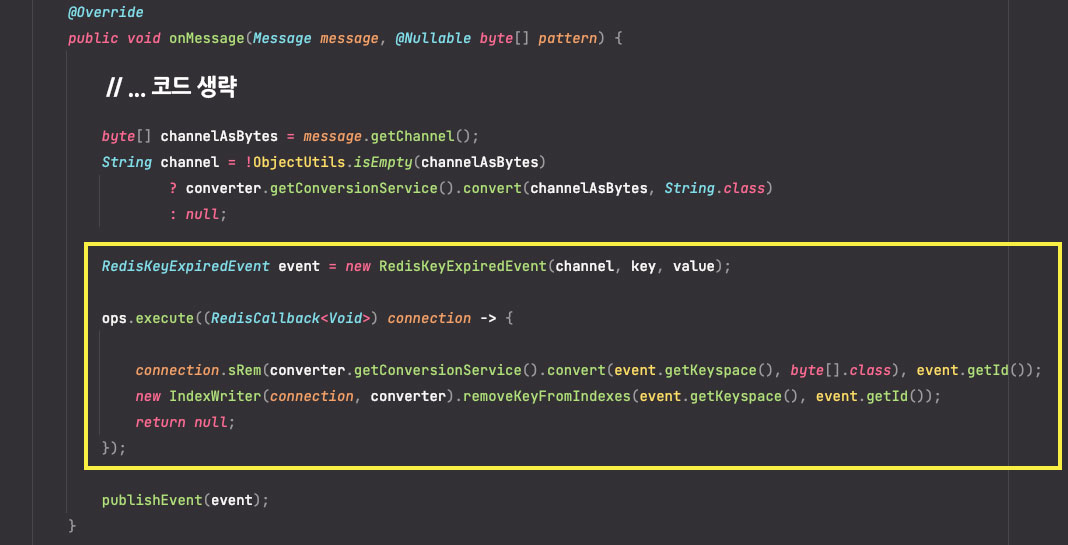 onMessage() 메서드에서 중요한 부분은 바로 파라미터로 들어온 message를 통해 RedisKeyExpiredEvent 인스턴스를 만들어서 다시 redis에 콜백을 보내는 부분인데요.
