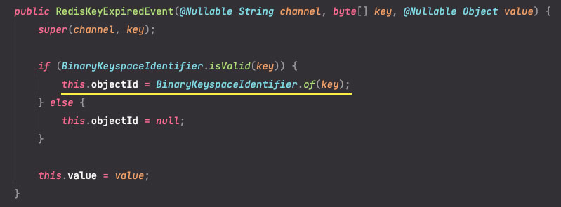 원인은 파악이 되었고, 가져오는 keyspace가 다른 이유를 확인하기 위해 RedisKeyExpiredEvent 생성자를 살펴보면, 내부적으로 BinaryKeyspaceIdentifier.of() 메서드를 통해 objectId를 만드는 것을 볼 수 있는데요.