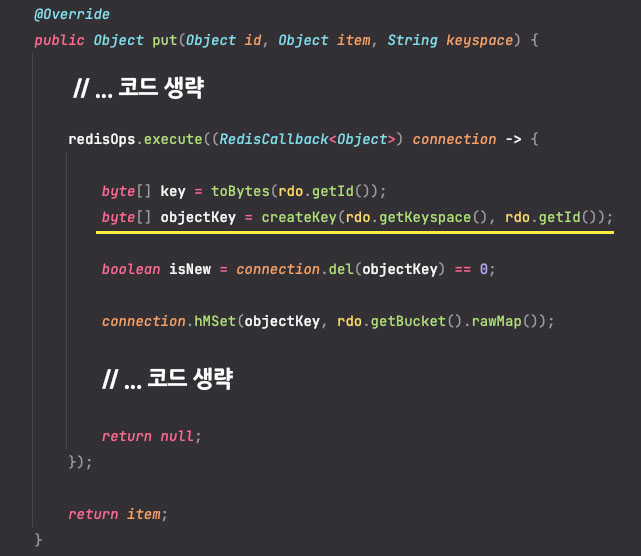 해당 메서드는 중간 부분에 redisOps.execute((RedisCallback<Object>) connection -> { ... } 으로 수행되는 람다식 메서드 부분을 살펴보면, 'createKey()' 메서드를 통해 objectKey를 생성하는 것을 확인할 수 있는데요.