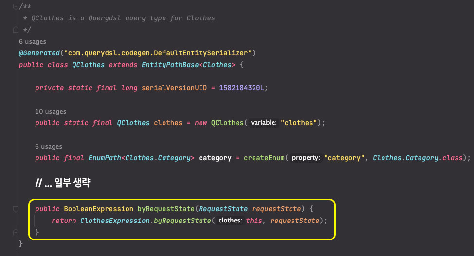 이렇게 @QueryDelegate 어노테이션을 적용한 정적 메서드를 만들고 다시 QClass를 생성하게 되면, 아래와 같이 해당 QClass에 위 ClothesExpression에서 생성한 정적 메서드를 사용하는 메서드가 생긴 것을 확인할 수 있는데요.