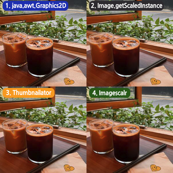 리사이징 품질로 봤을 때는 Graphics2D와 Scalr(내부적으로 Graphics2D를 사용)가 나머지에 비해 떨어지는 것을 볼 수 있는데요.