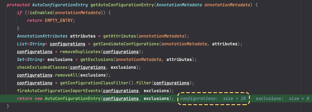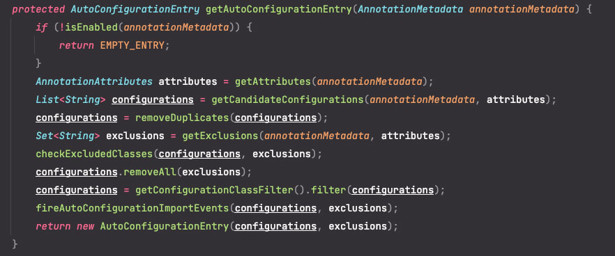 이처럼 getCandidateConfigurations() 메서드를 통해 자동 구성에 사용될 모든 후보 빈들의 정보를 가져오는데요.