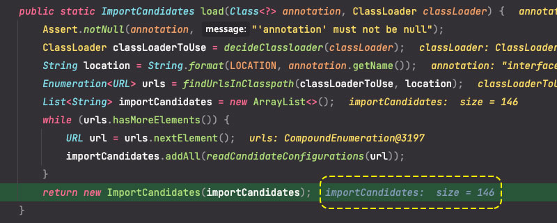 getCandidateConfigurations() 메서드를 타고 들어가 보면 ImportCandidates 클래스의 static method인 load() 메서드를 통해 META-INF/spring/org.springframework.autoconfigure.AutoConfiguration.imports 파일에 있는 146개의 AutoConfiguration 클래스들의 경로가 포함된 풀 네임을 가져오는 것을 확인할 수 있습니다.