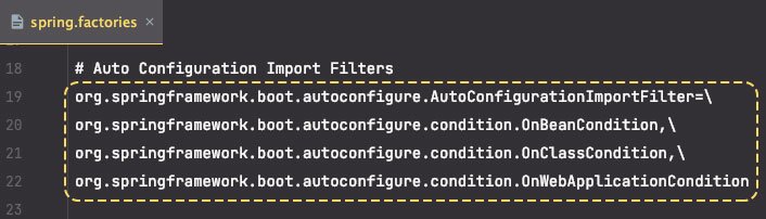 getAutoConfigurationEntry() 메서드의 내부 과정을 조금 더 자세하게 살펴보면, getConfigurationClassFilter() 메서드에서는 spring-boot-autoconfigure 라이브러리 내부의 META-INF/spring/spring.factories 파일을 읽어 OnBeanCondition, OnClassCondition, OnWebApplicationCondition 필터를 담은 ConfigurationClassFilter를 반환하는 것을 확인할 수 있었습니다.
